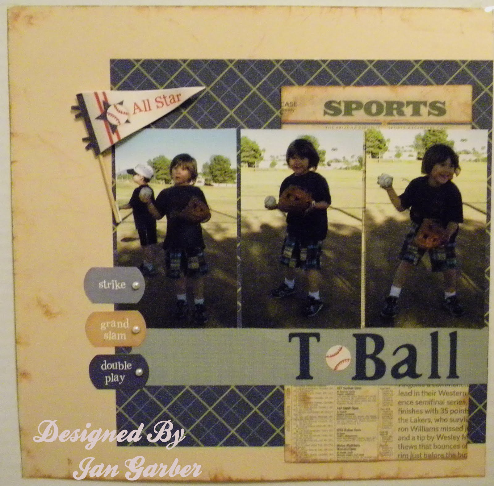 RECIPE: Paper, Chatterbox, Tie Plaid; baseball, Sticko; Cricut title, Base Camp; Pennant, Doodlebug; hand-cut swirl. The newspaper print was made by scanning and printing an actual sports page!
